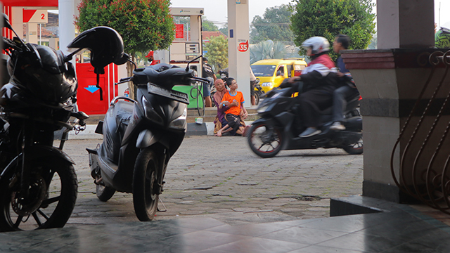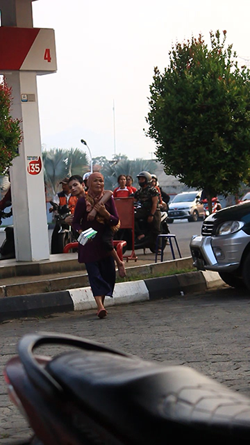 Pemandangan tak biasa terlihat di rest area siang itu. Seorang Ibu menggendong anaknya yang nampak sudah dewasa di punggung seraya menawarkan tissue kepada pengunjung yang beristirahat.