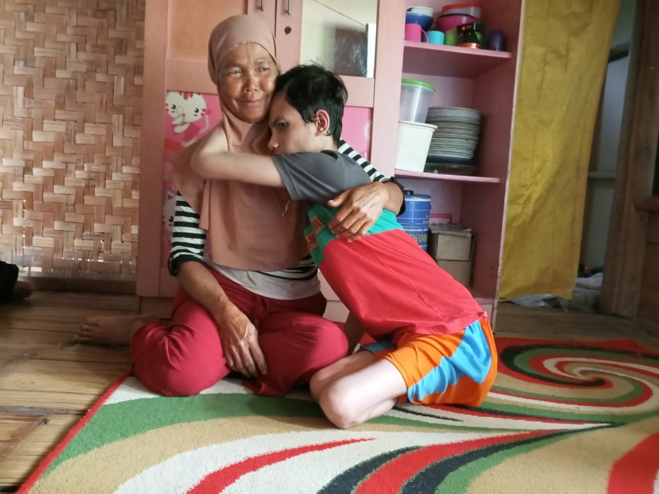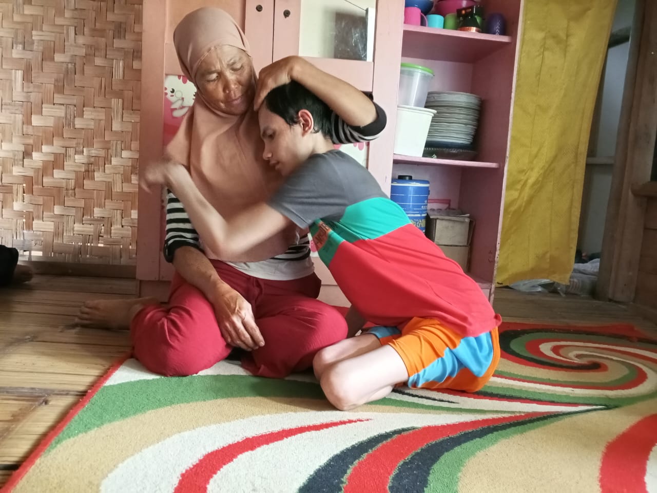 Punggung bu Kokom (52) yang sudah tak lagi muda itu nampak tergopoh menggendong seorang remaja laki-laki. Riyan (19) yang sendari kecil telah lumpuh dan tak berdaya, nyaris semua kebutuhan Riyan harus di bantu oleh bu Kokom.