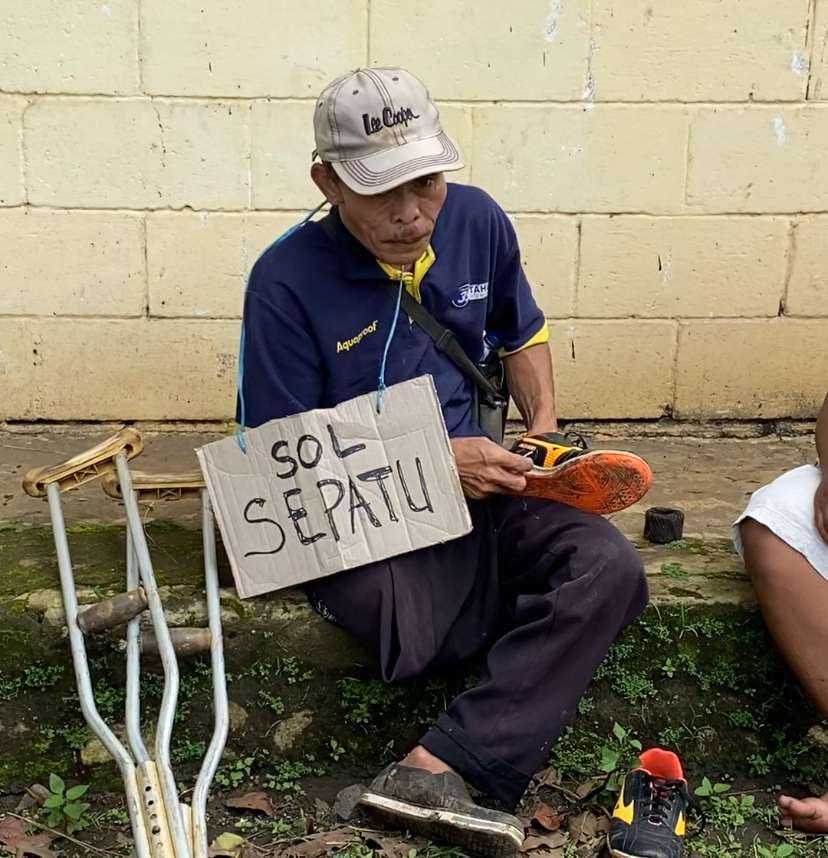 berbekal kemampuan mengesol sepatu, ia mulai bangkit dari keterpurukan. langkah demi langkah ia pacu meski dibantu oleh tongkat, ia berkeliling menjajakan jasanya untuk sol sepatu.