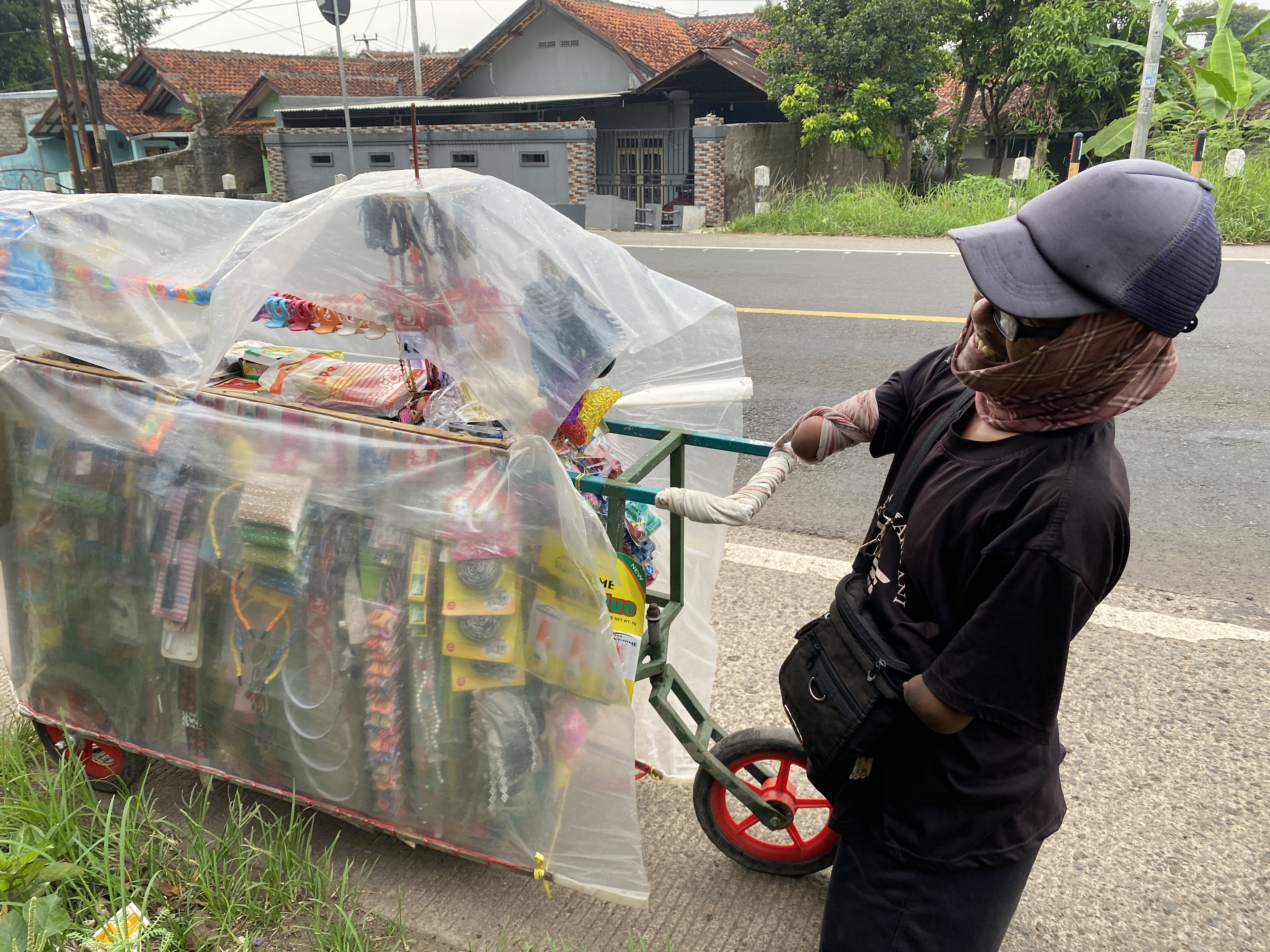 Suara sandal terseok-seok terdengar ketika gerobak didorong. Pak Cecep (43) berjualan dengan mendorong gerobak aksesoris secara keliling.