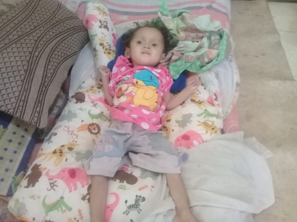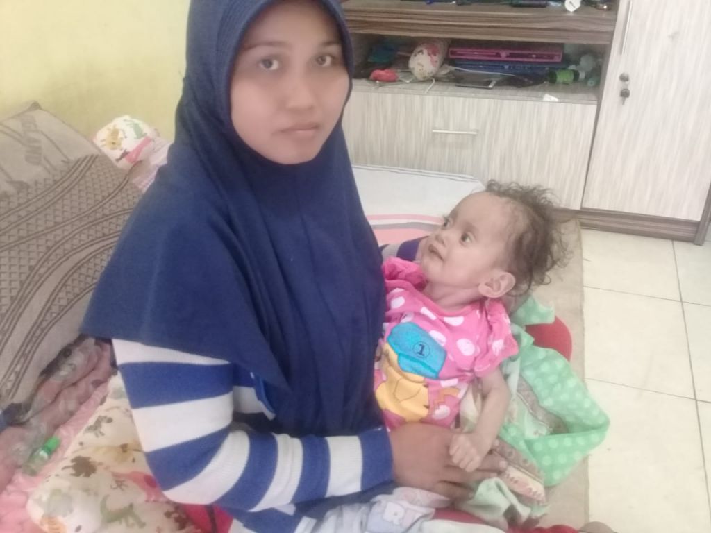 Kini Usia Ina 16 bulan dan kondisi Ina saat ini hanya bisa terbaring di kasur, rewel seperti menahan sakit, sesekali tenang ketika sang ibu menggendongnya.