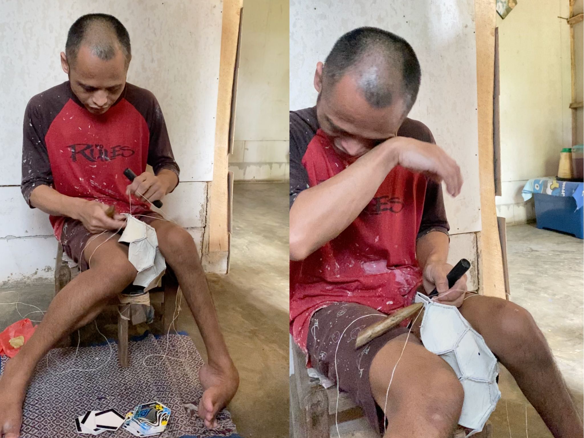 Setiap hari ia menjadi pengrajin bola sepak, sehari hanya dapat 2 bola dengan diupah 7500/bola. jika ingin dapat upah lebih ia harus menjajakan bolanya juga. namun sudah 3 hari ini ia tak bisa membuat bola karna bahannya tak ada. baru hari ini ada ia bisa kerjakan dan menjualnya.