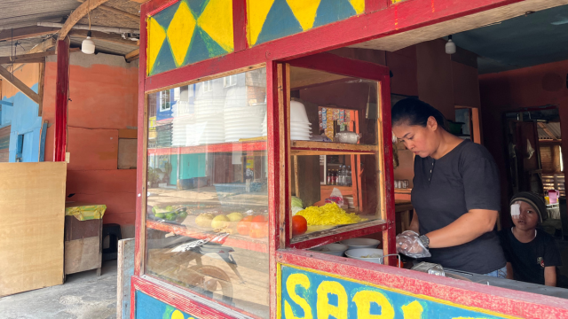 “Anak saya sakit kanker mata, mata kanannya sudah diangkat namun masih menjalani pemeriksaan karena kemungkinan ada penyebaran di mata kirinya. Sebenarnya kasian bawa dia kerja seharian, tapi saya lebih gak tega tinggalin dia di rumah sendirian nggak ada yang jaga karena saya dan suami sudah bercerai”- ibu Khenzi.