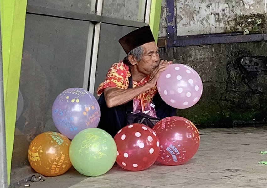 Nafasnya terengah-engah meniup balon, dahinya basah dengan keringat. Abah tetap berusaha dengan sisa nafas dan tenaganya, Berharap ada yang membeli balon jualannya.