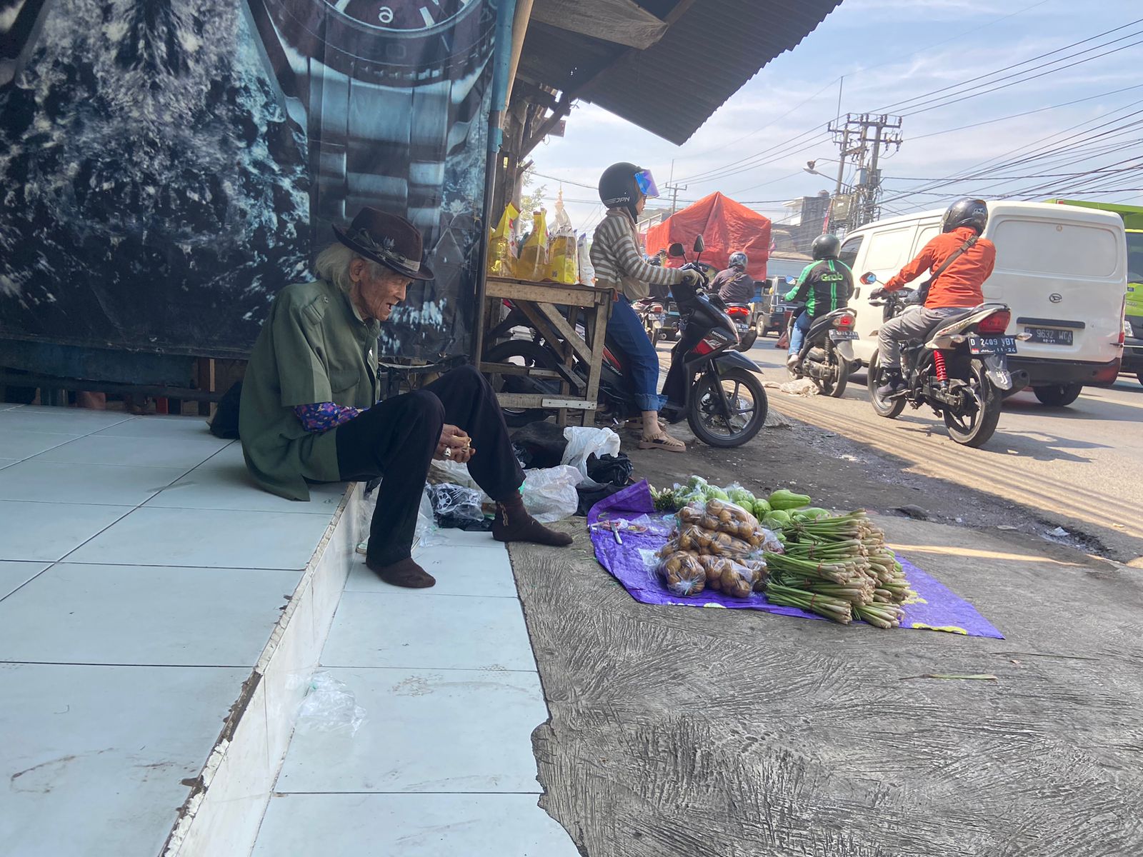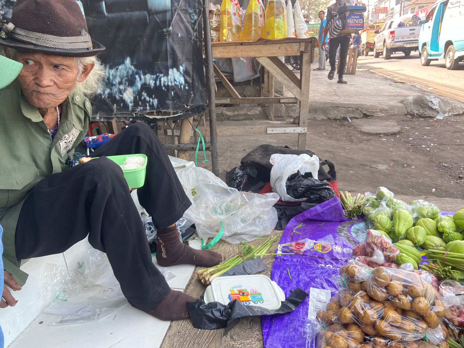 Beliau itu menjual labu siam, timun dan sereh, yang harga jual perkilonya tidak lebih dari 10rb rupiah untuk labu dan timun dan barang dagangannya paling hanya 10kg jika ditotal. Itupun sering tidak laku.. Abah Atang harus membawa sebagian besar sisa dagangannya kembali ke rumah.