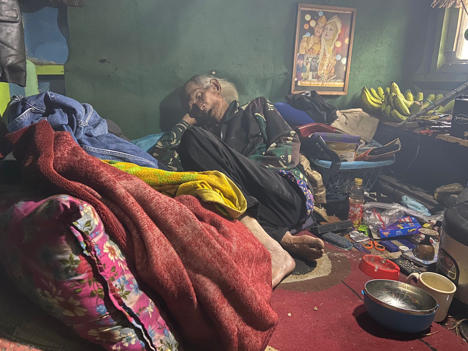Tampak terilhat tumpukan barang yang lusuh juga tungku kayu seadanya untuk beliau memasak makannannya. Tidurpun diatas kasur tipis yang telah usang. Beliau ini sebatang kara, hanya hidup sendiri di masa tua dengan kerasnya hidup.