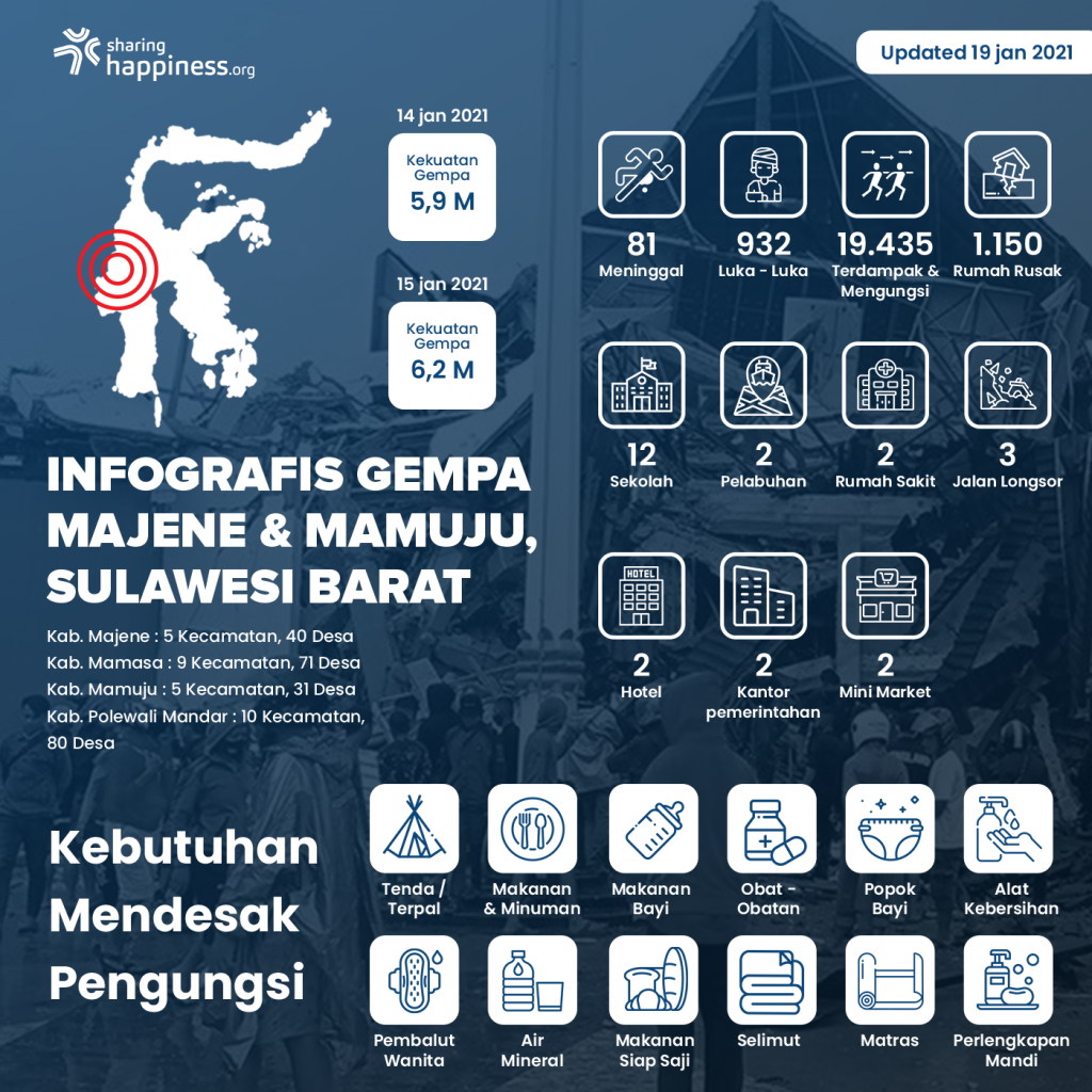 Gempa berkekuatan 6,2 Magnitudo dengan pusat gempa berada di 6 Km Timur Laut Majene, Sulawesi Barat. Gempa juga terasa hingga wilayah Makassar dan Palu.