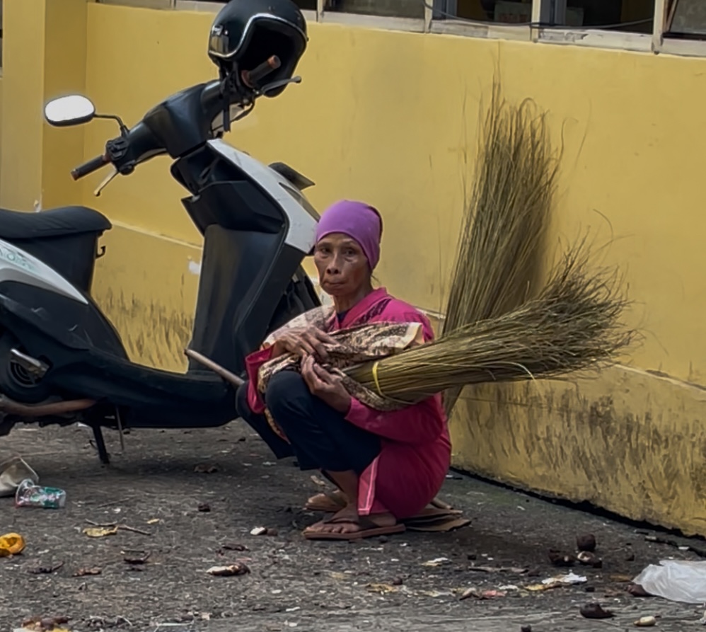 Dengan tubuh renta berjalan sambil memegang tongkat Mak Titin keliling pasar menjajakan jualan sapu hasil buatannya. Setiap hari ia berharap dagangannya habis agar bisa punya uang buat beli beras tuk makan. Namun kenyataannya, sapu itu belum ada yang laku.