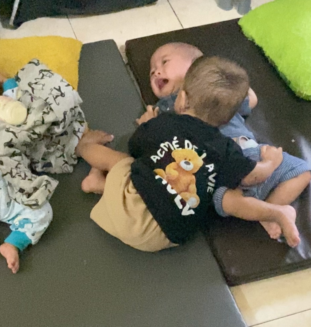 Aku lihat sendiri… ada satu bayi nangis kenceng banget, harusnya digendong ibu atau ayahnya. Tapi ini justru ditenangkan oleh bayi lain di sebelahnya, pelan-pelan diraih tangannya dan dipeluk… seolah saling menguatkan.