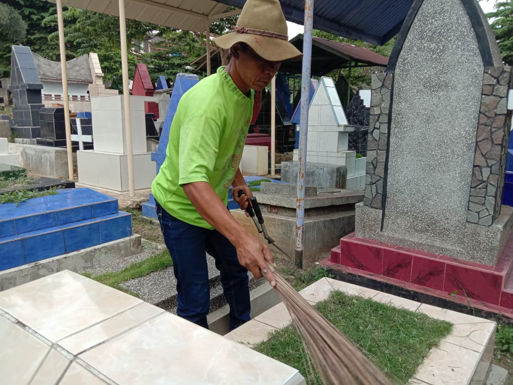 Bapak dana (49 tahun) dengan sabar membersihkan makam sampai semua area pemakaman umum yang dikelolanya bener-bener rapih dan bersih.