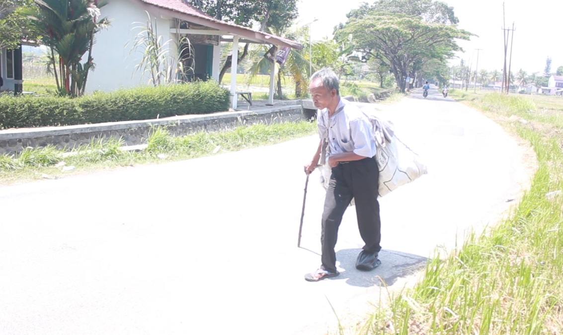 Pemandangan tak biasa tampak di samping jalan siang itu. Matahari tengah tinggi, nampak seorang Lelaki tua berjalan tertatih dengan menyeret sebelah kakinya yang terlihat di bungkus kantong kresek. Sedang sebuah karung besar nampak tergantung di pundaknya ditopang oleh sebelah tangan, sedang sebelah tanganya nampak mengkerut di dada. Sebuah postur khas seorang penderita stroke.