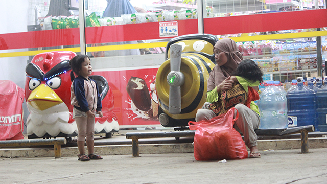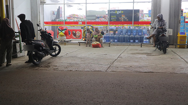 Waktu menunjukkan pukul 21.00 WIB saat kami tengah menuju ke salah satu mini market. Terlihat di depan mini market itu ada seorang ibu yang tengah membawa kedua anaknya sambil berjualan.