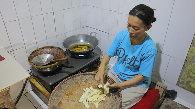 Ibu Erni sudah mulai menyiapkan dagangan yang ia buat sendiri sejak pukul dua dini hari. Modal yang ia dapatkan berupa barang merupakan pinjaman dari sang Bandar pisang majikanya.