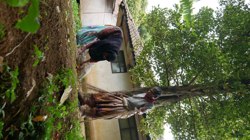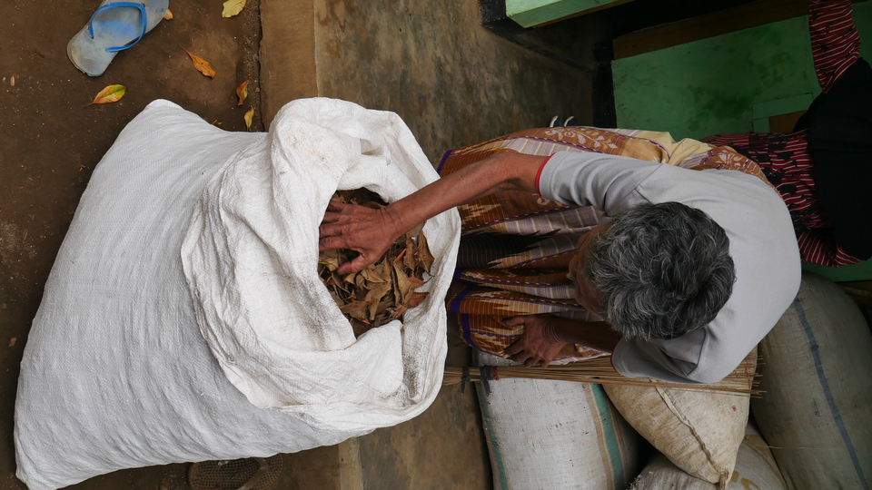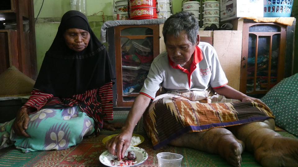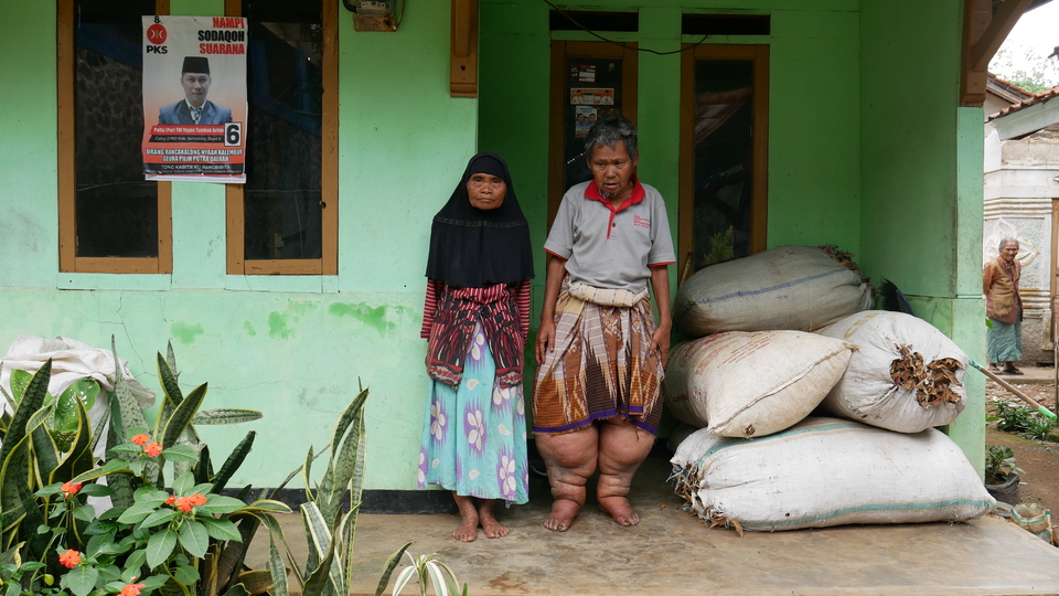 “Semakin hari, kaki saya rasanya semakin berat. Jalan juga makin sulit. Agak lebih susah sekarang kalau lagi kerja ngumpulin daun cengkeh. Sering sakit, tapi ya gimana lagi, saya harus tetep kerja cari nafkah”, ujar Pak Yuyu yang mengalami penyakit Kaki Gajah
