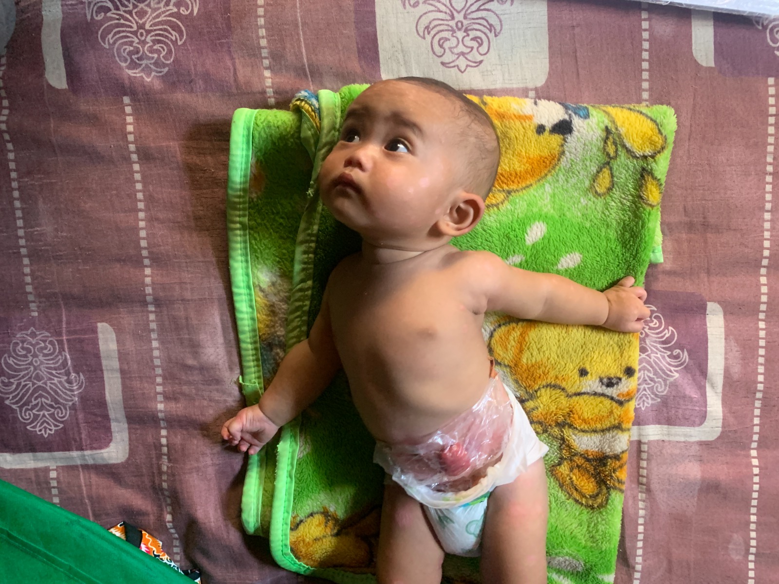 Sejak lahir, Qosim (10 bulan) langsung merasakan operasi pertamanya. Dia tidak bisa menangis, perutnya kembung, wajah pucat dan muntahnya berwarna hijau. Bayi mungil itu harus segera operasi karena tidak memiliki anus.