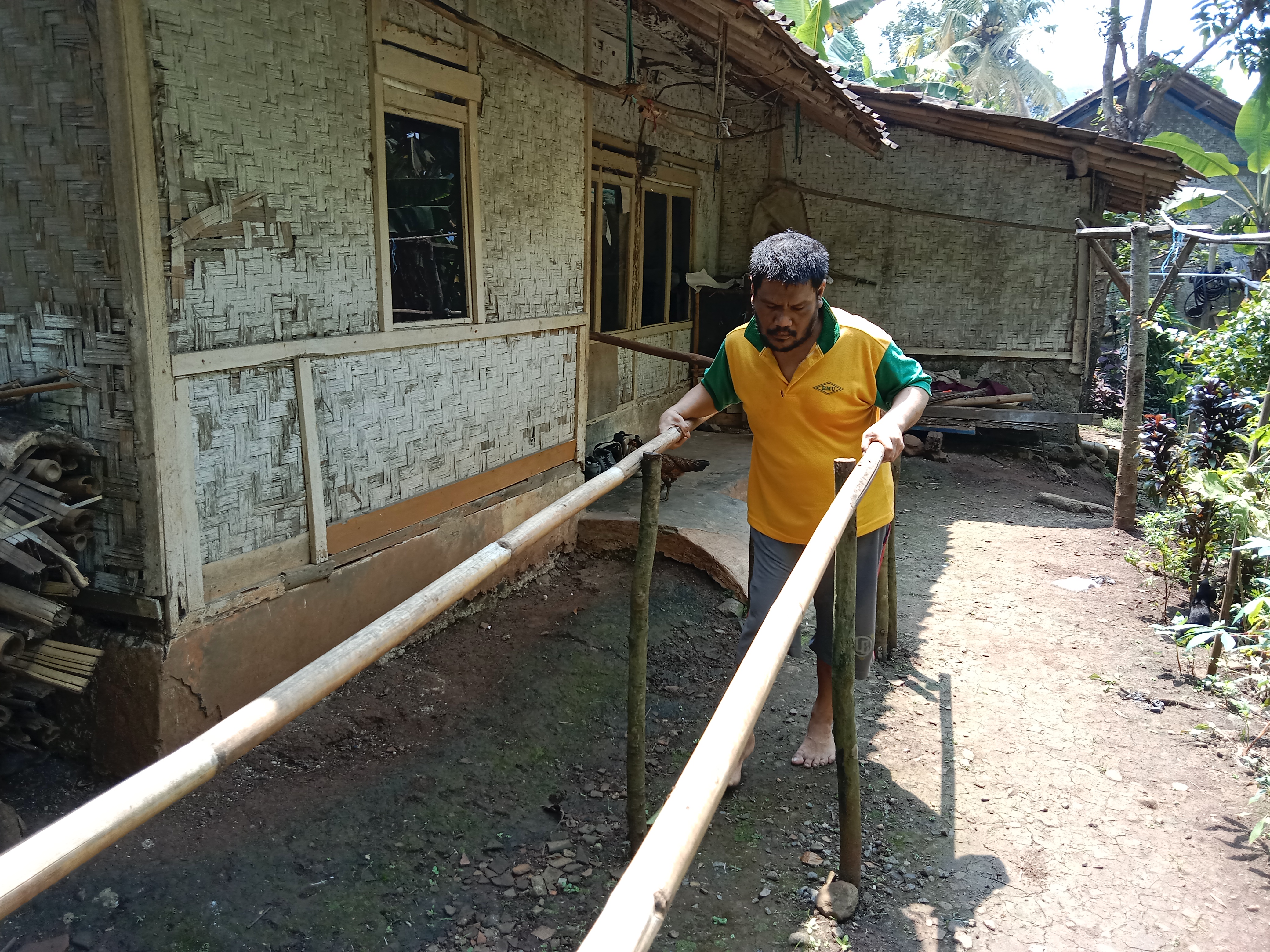 Tak ingin terus menjadi beban, Pak Nurfa'i setiap hari terus berlatih berjalan di lintasan sederhana yang dibuat dari bambu dan kayu alakadarnya. Ini satu-satunya ikhtiar yang bisa dilakukan setelah 3 tahun lamanya tidak pernah menjalani pengorbatan apapun.
