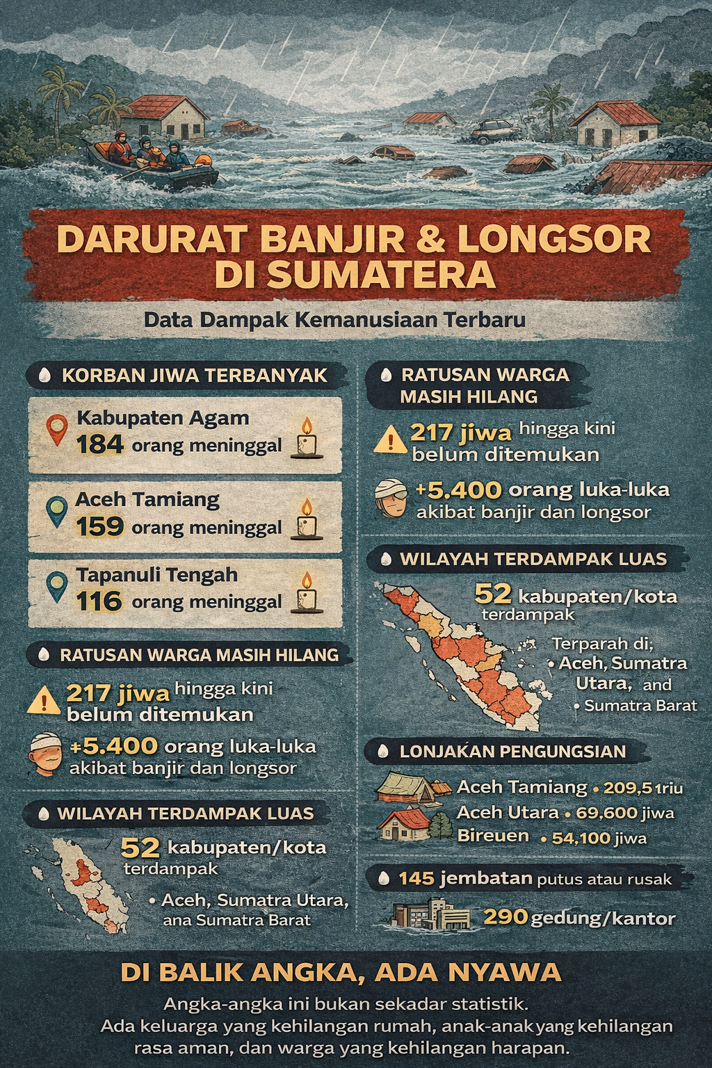 Menurut keterangan pihak kepolisian di Sumut, laporan korban terus diperbarui seiring proses pencarian dan evakuasi yang masih berlangsung. Kondisi di lapangan menunjukkan betapa beratnya situasi—akses yang lumpuh membuat bantuan belum dapat menjangkau seluruh lokasi.