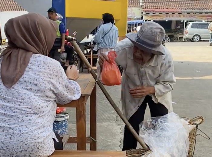 Namun, demi lanjutkan hidup bersma sang istri tercinta, kakek tetap memikul dagangan opaknya dengan langkah pelan namun pasti.