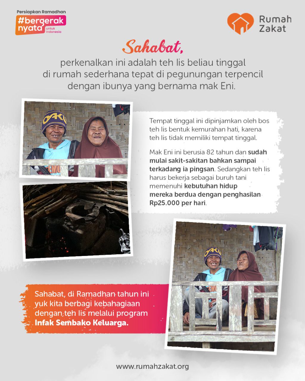Sahabat, di Ramadhan tahun ini yuk kita berbagi kebahagiaan dengan teh Iis, Mak Eni dan Lansia lainnya melalui program Infak Sembako Keluarga.