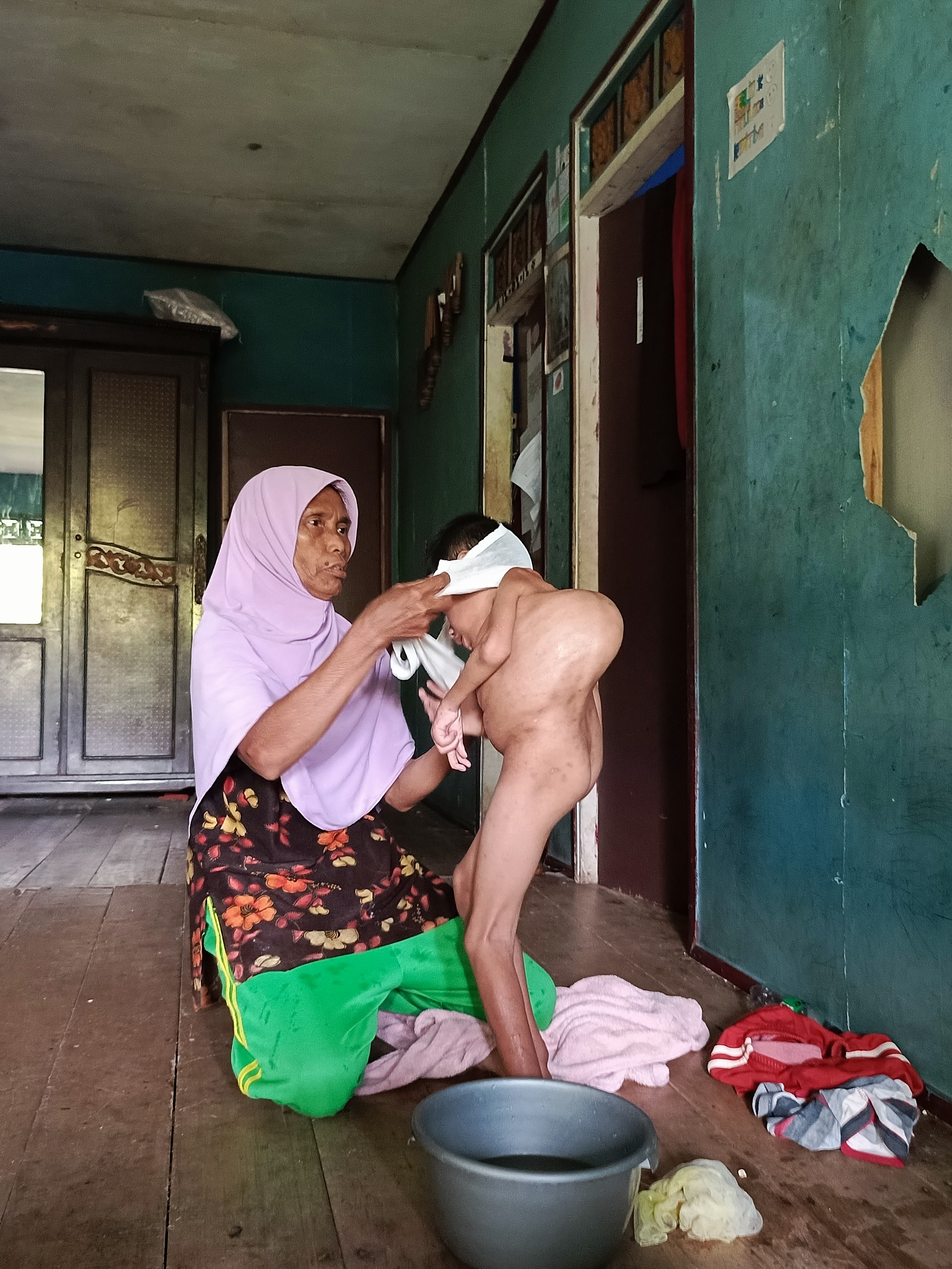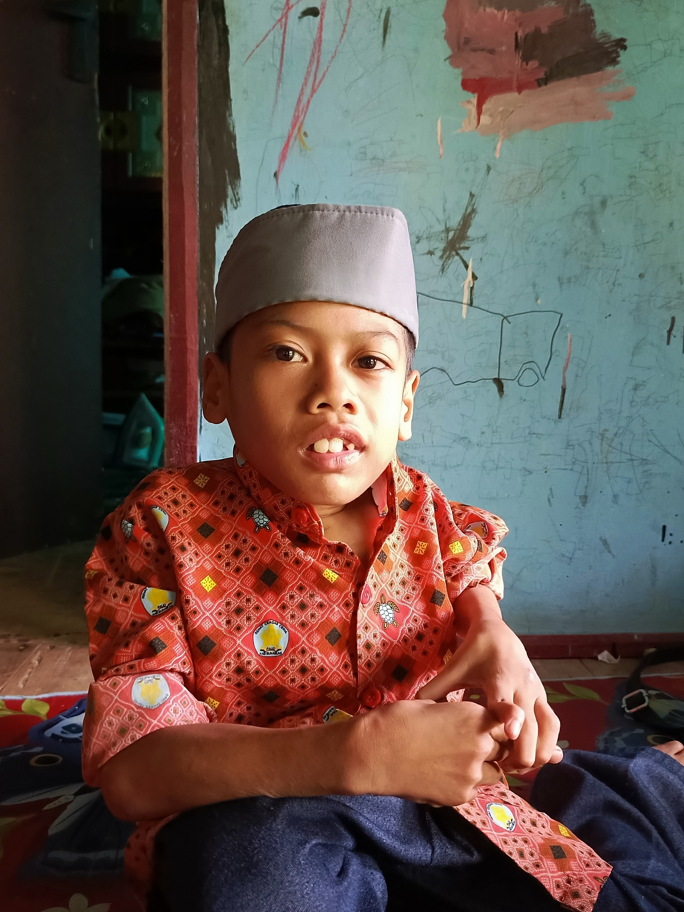 Ada rasa sesak ketika ia berbicara terlalu banyak, begitu pun saat berjalan. Nafasnya terengah ketika melakukan aktivitas yang terlalu berat. Di usianya saat ini, ia tengah duduk di bangku kelas 2 SD. Tetapi dengan kondisinya yang terbatas untuk bergerak, ia hanya mampu untuk mengenyam sekolah agama.