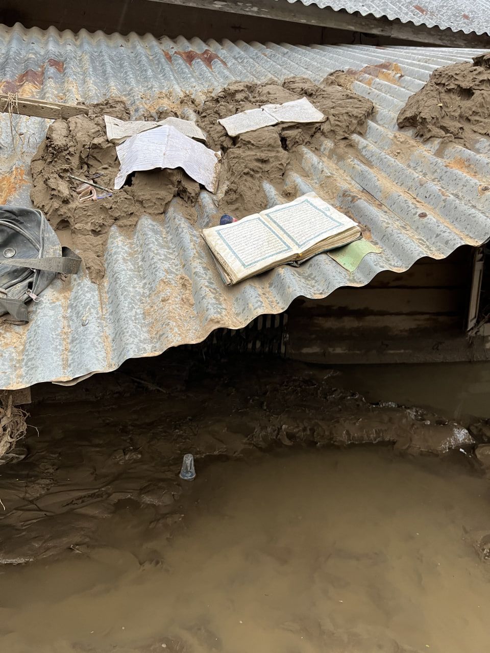 Termasuk yang ikut terdampak parah adalah fasilitas ibadah seperti masjid, mushola, berikut dengan perlengkapan ibadah seperti sarung, mukena, dan lainnya, semua dalam kondisi rusak tak lagi bisa dipakai.