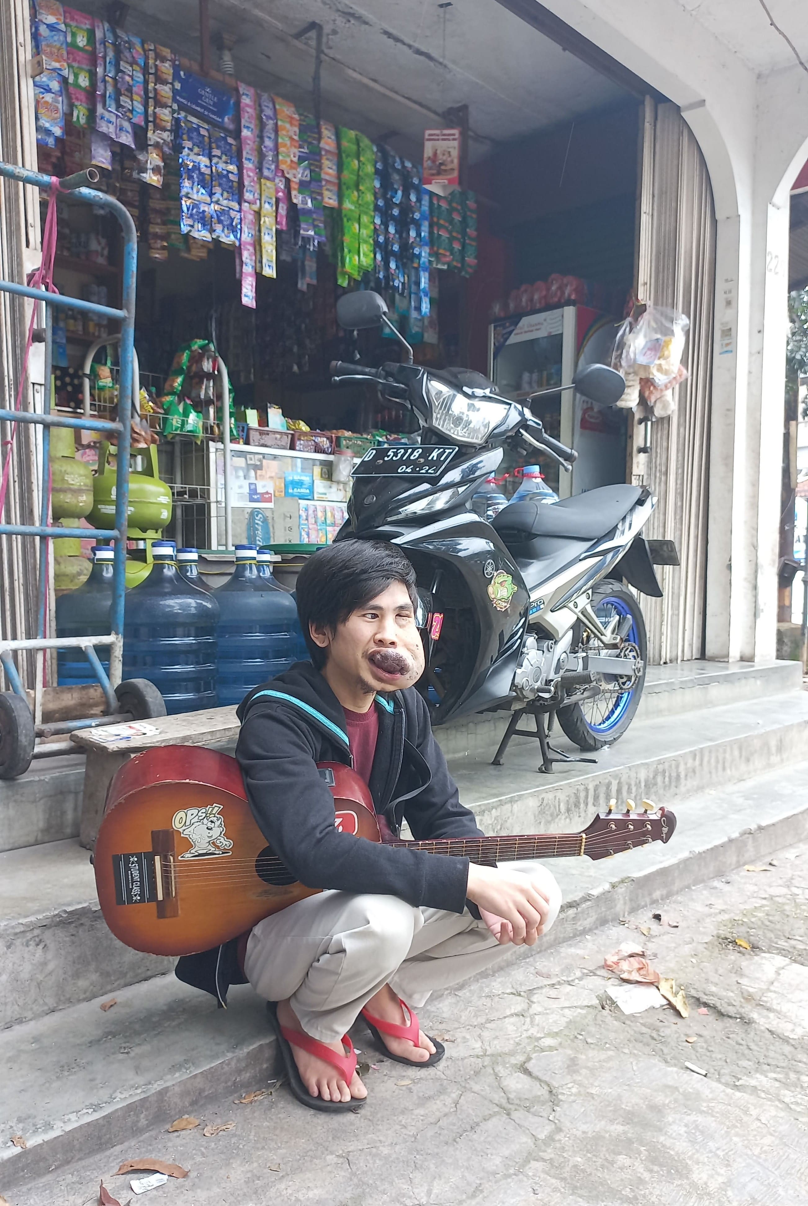 Hidup di jalanan sebatang kara menjadi pengamen dengan keadaan fisik wajah yang memprihatinkan.