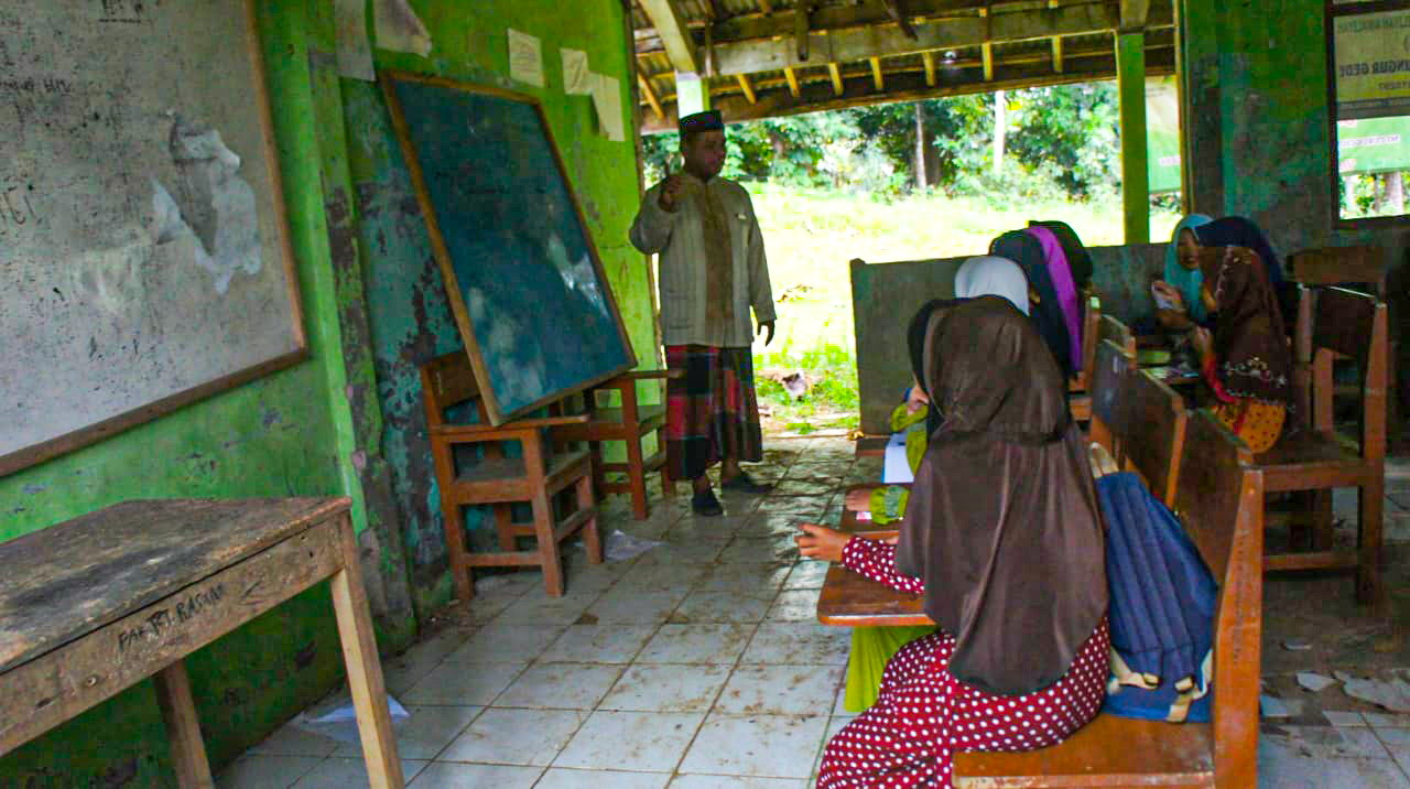 Jika hujan turun, anak-anak basah kuyup karena sebagian besar atapnya bocor. Namun demikian, para santri sangat antusias untuk belajar meski terhalang kondisi sekolah yang jauh dari kata layak.