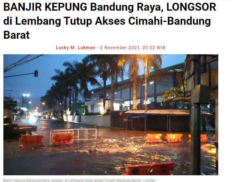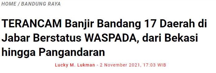 Terancam banjir bandang, sebanyak 17 daerah di Jabar berstatus waspada selama November 2021. Ke 17 daerah tersebut dimulai dari Bekasi hingga ke Pangandaran. Daerah Bandung Raya termasuk paling banyak daerah yang berstatus waspada.