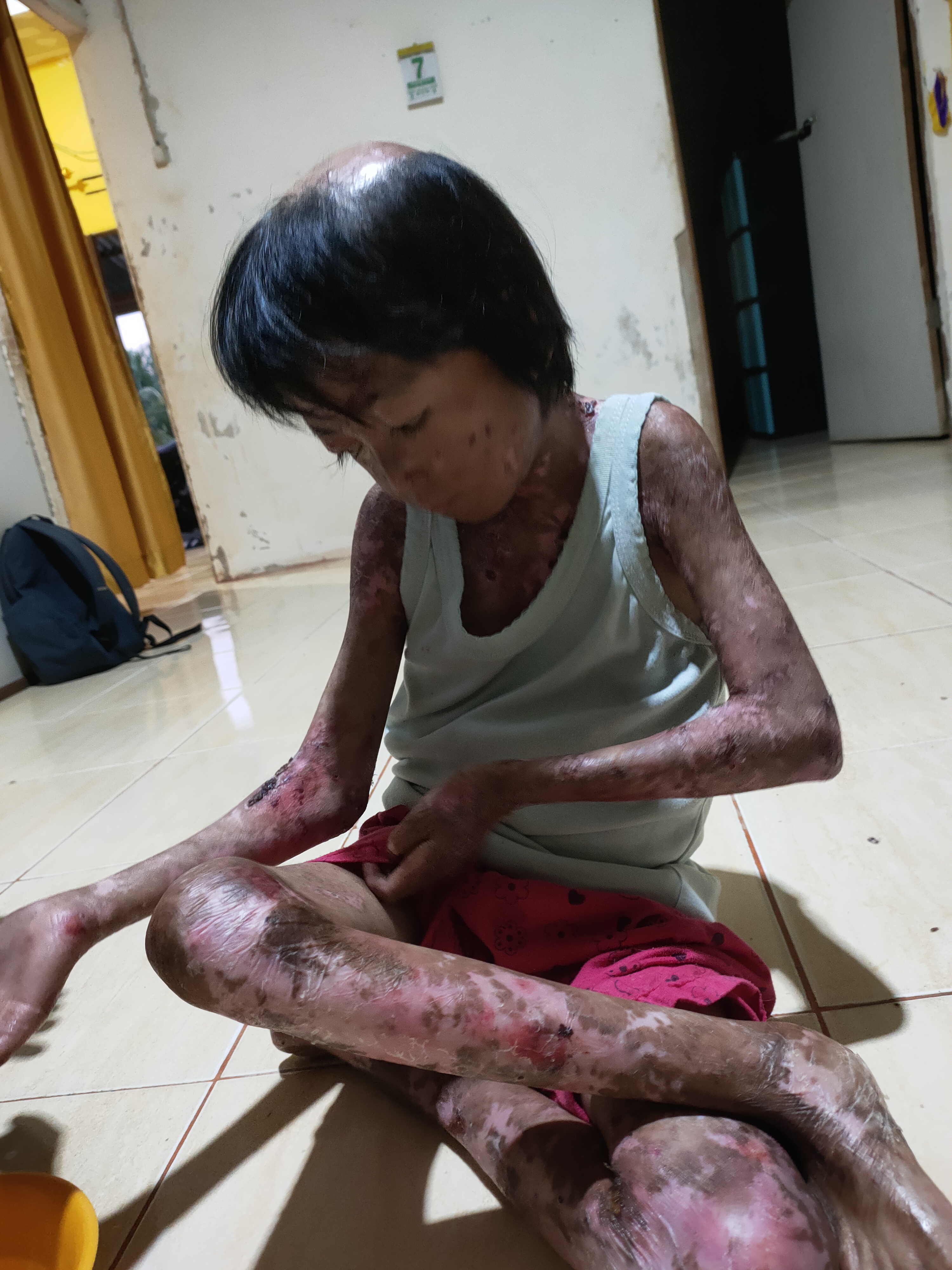 Rambutnya pun mengalami kerontokan dan seluruh badan nya banyak luka, koreng dan tak memiliki kuku jari serta badan nya pun mengeluarkan bau.