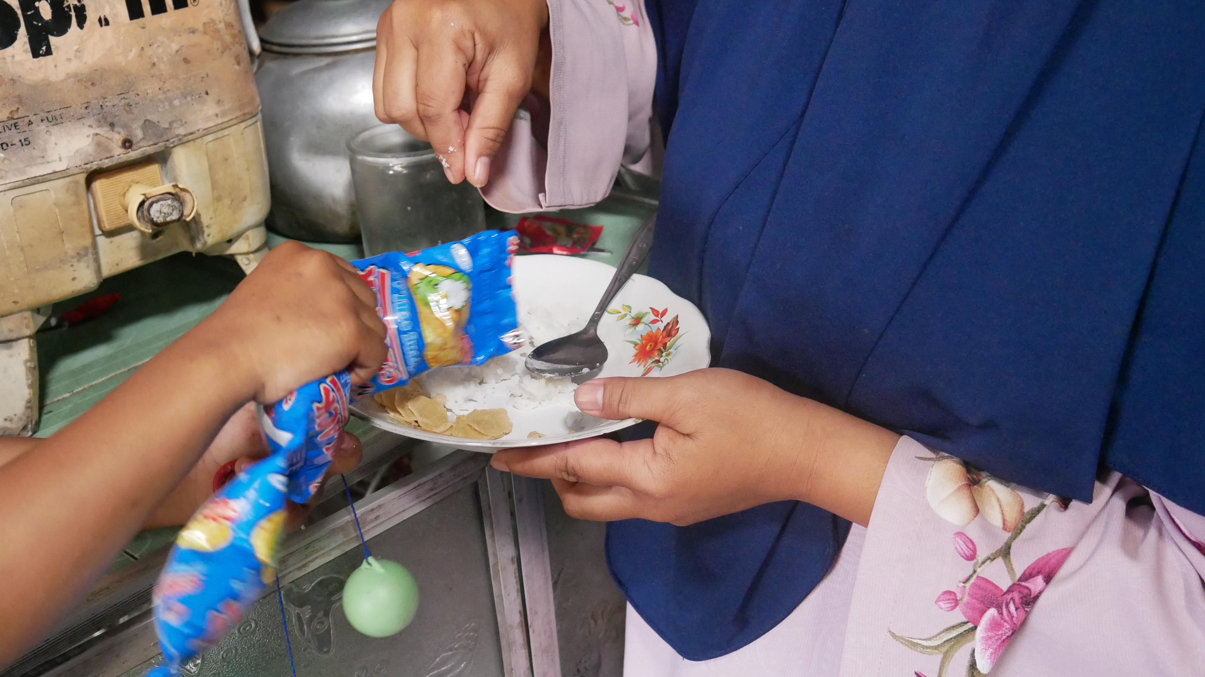 “Kadang-kadang, karena ga ada uang, untuk teman nasi anak-anak, pake snack jajanan anak yang 500 perak untuk lauk“, ujar Bu Siti.
