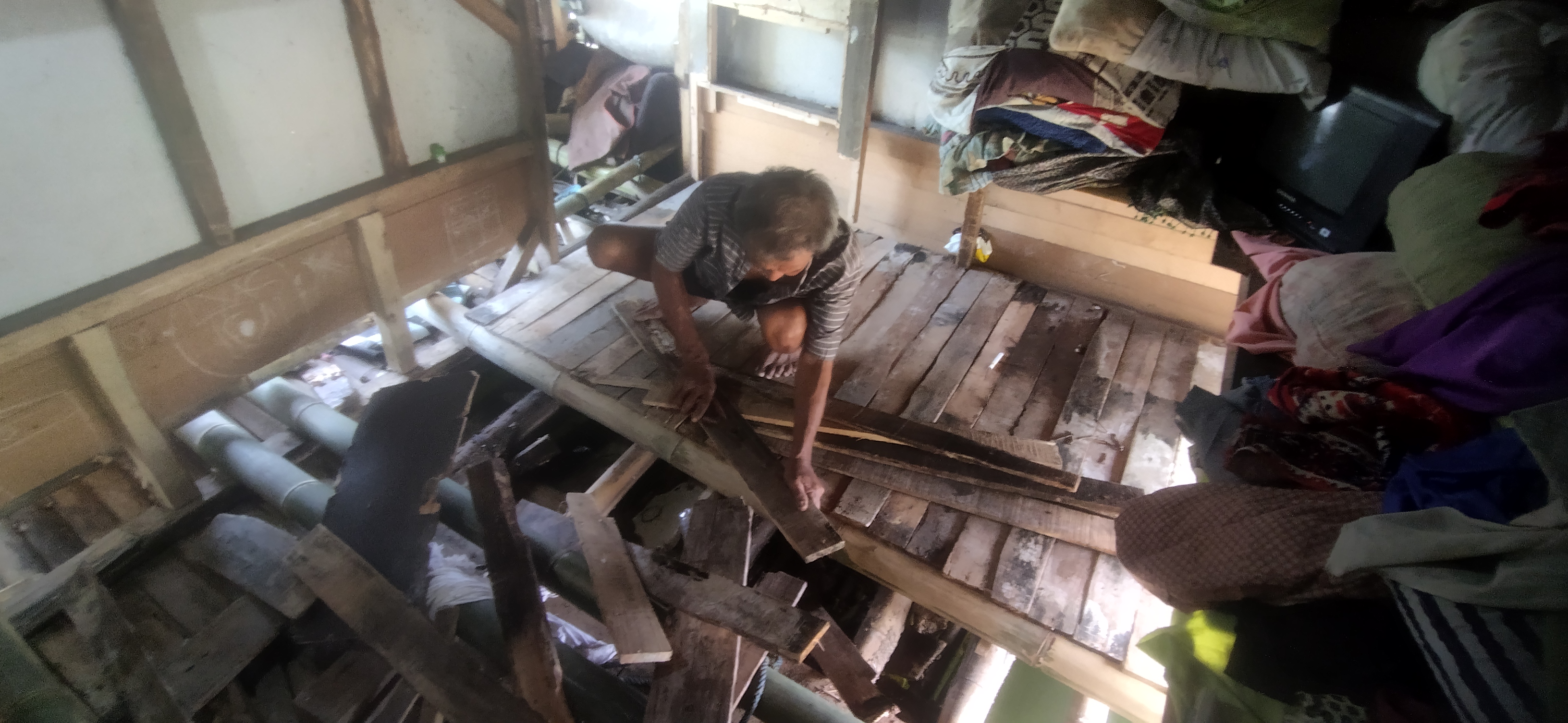 Abah rutin membetulkan lantai gubuknya dengan mengganti bambu yang sudah rapuh menjadi bambu baru. Karena jika tidak, gubuknya bisa tenggelam. Jika hujan lebat arus air di Situ Citarum meluap dan masuk ke dalam gubuk melalui sela-sela dinding, gubuk sampai terombang ambing, bahkan terkadang ular air pun sering masuk.