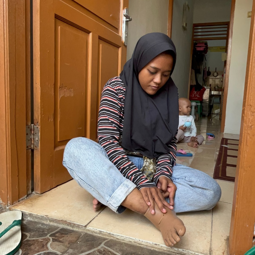 Tak jarang ibu Putri harus menggendong kedua anaknya Haflasea (2 th) & Hafizhan (7 bulan) karena rewel kesakitan akibat kanker mata yang diderita kedua balitanya. Belum lagi kakinya yang sering sakit karena kaki palsu miliknya sudah sobek.