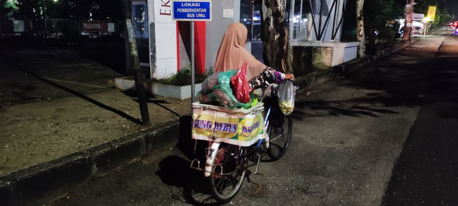 Namanya Ibu Wati (53) ia jualan sampai malam untuk menghidupi 3 anaknya di kampung. Namun, jualan dari tadi belum ada yang beli satupun.