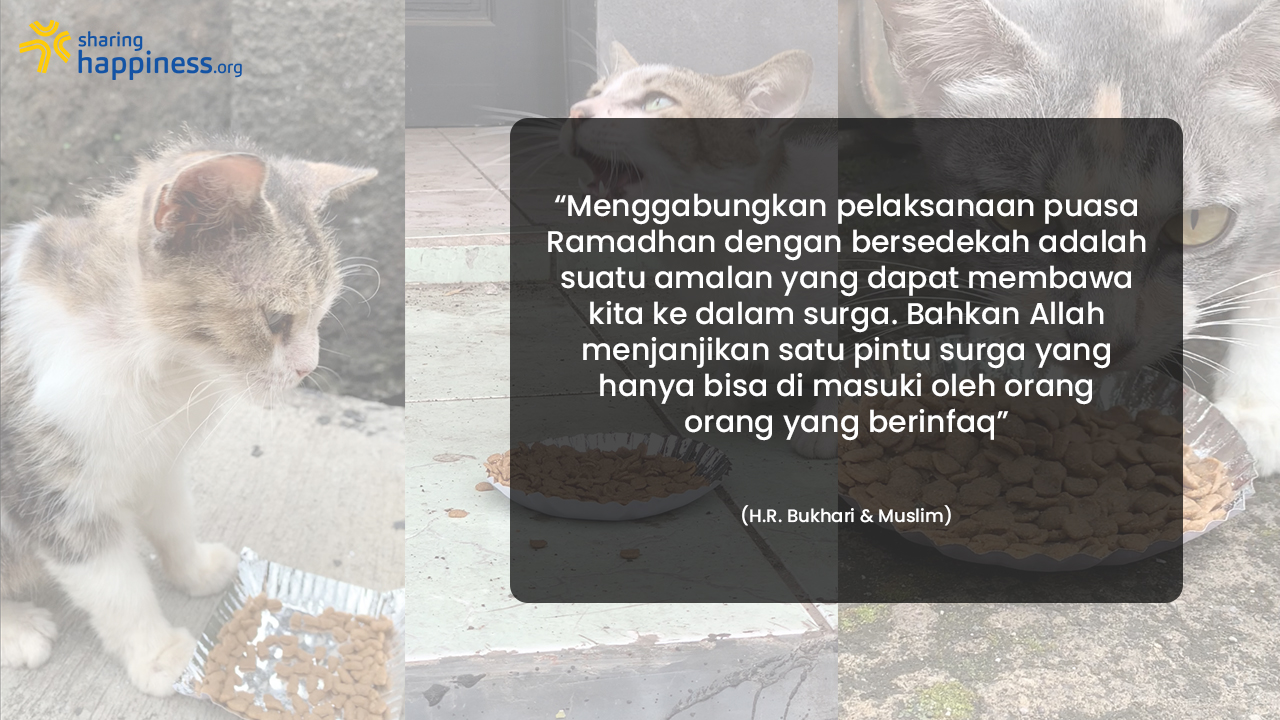 Di bulan Ramadan ini, mari berbagi kebahagiaan dengan ribuan kucing jalanan yang membutuhkan makanan untuk bertahan hidup. Dengan infaq Anda, Sharing Happiness dapat memberikan makanan yang cukup untuk kucing-kucing ini. Setiap infaq yang Anda berikan akan membantu mengurangi penderitaan dan kelaparan para kucing jalanan yang kurang beruntung.