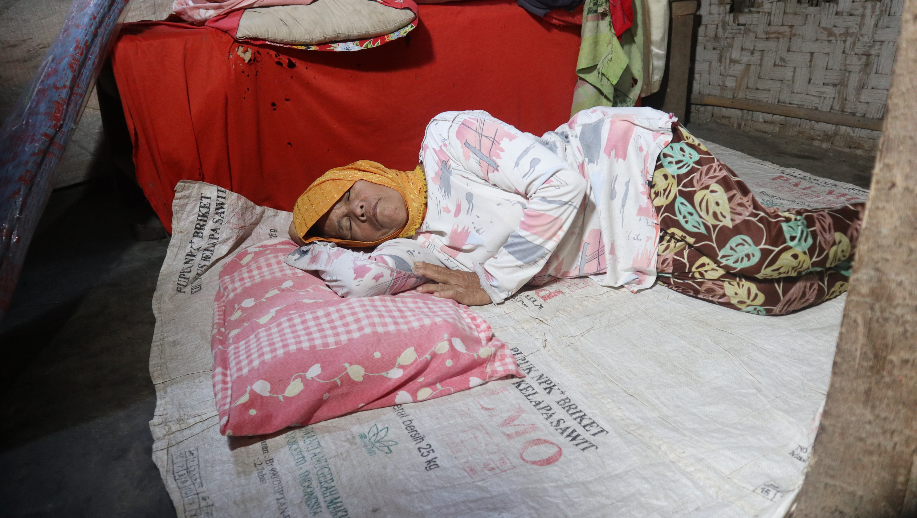 Rumah yang ia tinggali sendiri bercelah banyak juga tergenang saat hujan datang dan Mak Iin seringkali menangis tanpa suara meminta pertolongan tetangga ketika kondisi itu datang.