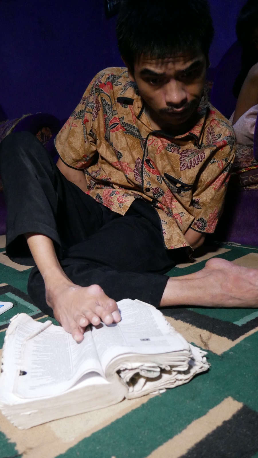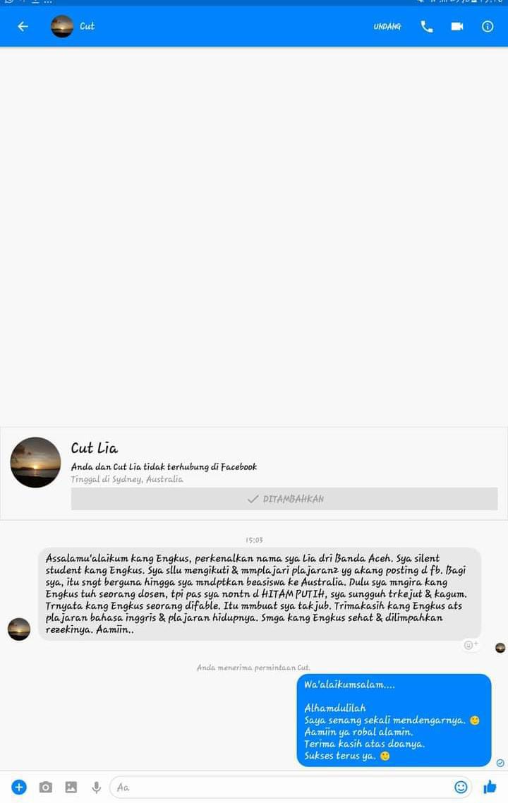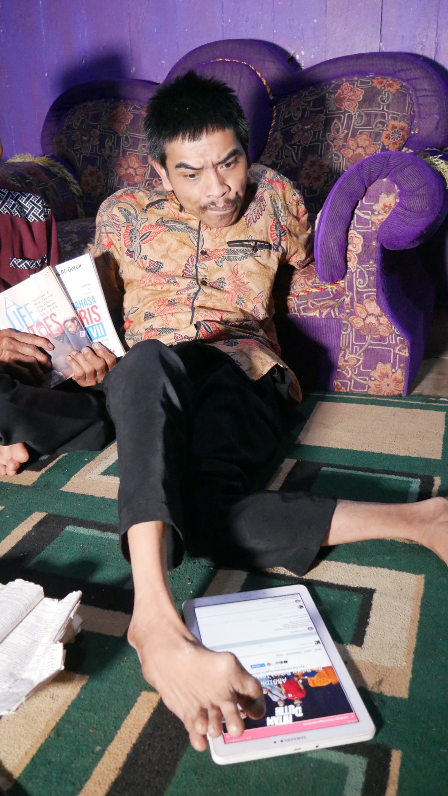 “Saya ikhlas kok harus mengetik materi bahasa Inggris menggunakan jari sepanjang malam. Trus saya posting di akun Facebook. Sebab cuma di malam hari internetnya lancar tidak lemot, maklum disini kan jauh di pelosok.”, ujar Engkus terbata-bata.