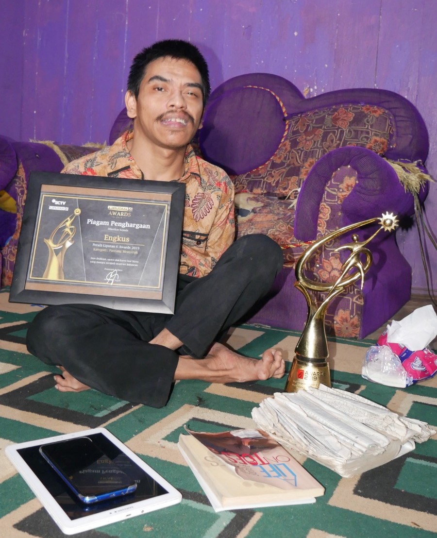 Sedangkan di siang hari, kedua Kaki Engkus digunakan untuk mengetik materi beserta penjelasannya di memo tablet jadul pemberian almarhum ibunya. Kemudian, materi tersebut Ia posting untuk digunakan sebagai bahan materi pembelajaran bahasa Inggris di malam hari.
