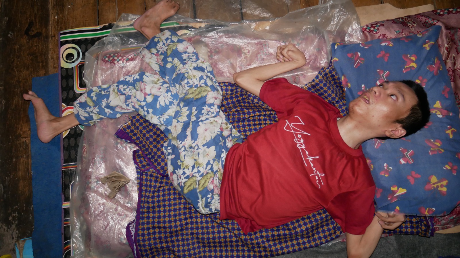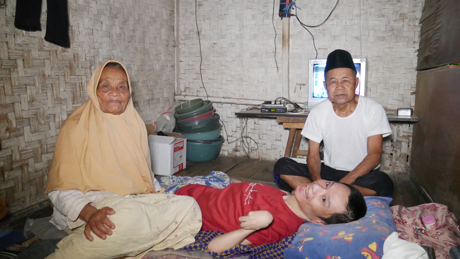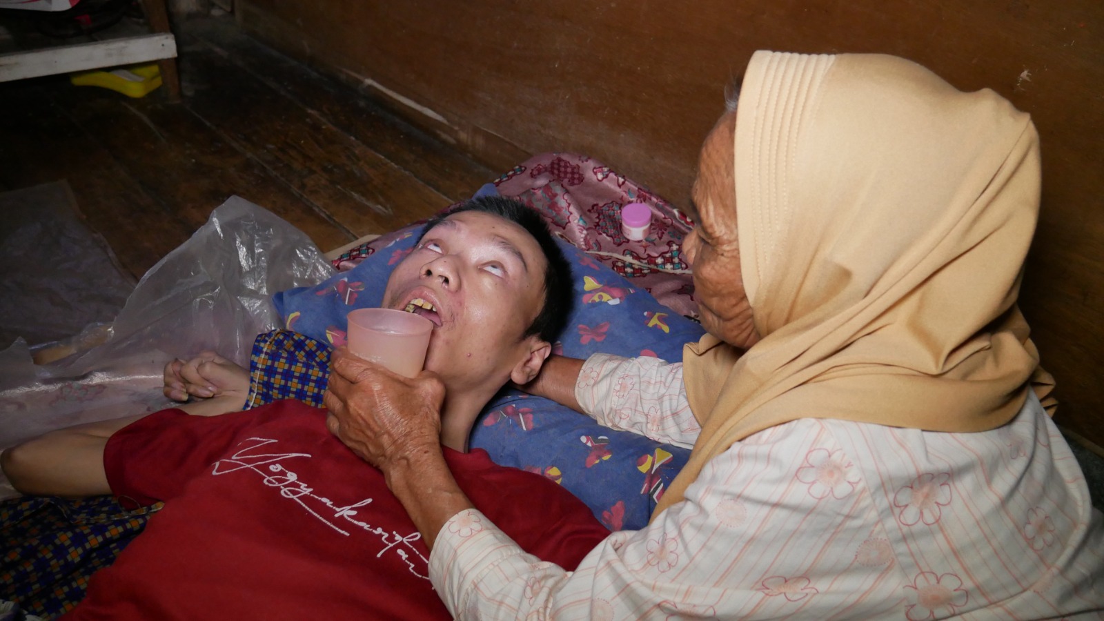“Usia Ahmad 25 tahun. Setiap hari ya cuma gini, tiduran aja. Tulang kaki sama tangan bengkok, tubuhnya kaku sama sering kejang-kejang. Bicara juga engga jelas, kayanya yang normal cuma mata sama telinga aja”, ujar Abah.