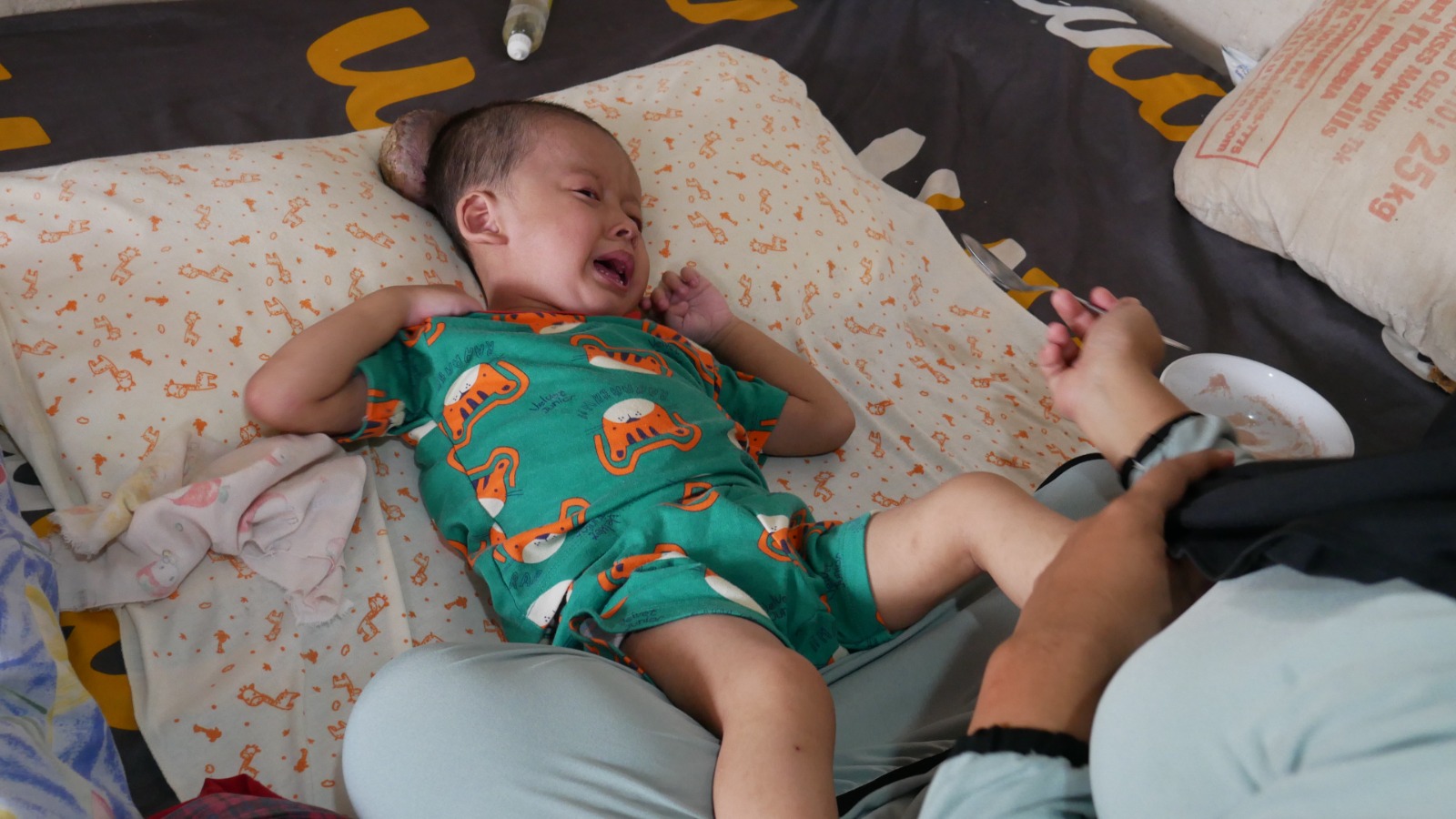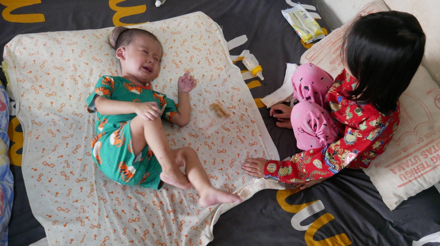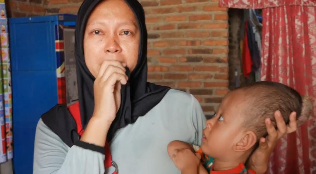 Seorang anak yang baru berusia 2 tahun terbaring di atas kasur sambil menangis cukup kencang di rumah yang kondisinya belum sepenuhnya selesai pembangunanya, itupun bukan rumah milik Orangtuanya, melainkan rumah saudaranya .