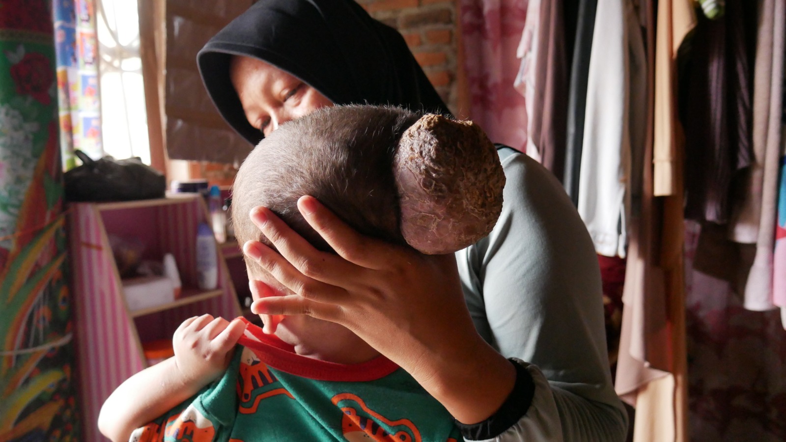 Menurut Bu Nuryati, anaknya mengalami sakit sejak dilahirkan ke dunia ini. Awalnya hanya benjolan kecil, tapi semakin ke sini malah makin bengkak bahkan membesar. Setelah usia 10 bulan, Abyaz kemudian dibawa ke rumah sakit (RS) Santosa untuk mendapatkan penanganan medis, itupun biayanya dibantu oleh pihak yang merasa Iba melihat kondisi De’ Abyaz.