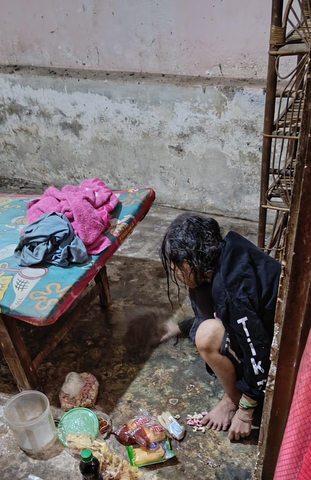 Tinggal disebuah kamar yang hanya berukuran 2x3 meter dengan kondisi yang sangat meprihatinkan, yakni bagian dinding baik sebelah kanan atau kiri, depan atau belakang seluruhnya berjamur dan terkelupas, sedangkan bagian atapnya hanya terbuat dari anyaman bambu yang sudah jebol, belum lagi bagian lantainya yang cuma pluran semen yang lembab dan terdapat kasur kecil yang sudah usang.
