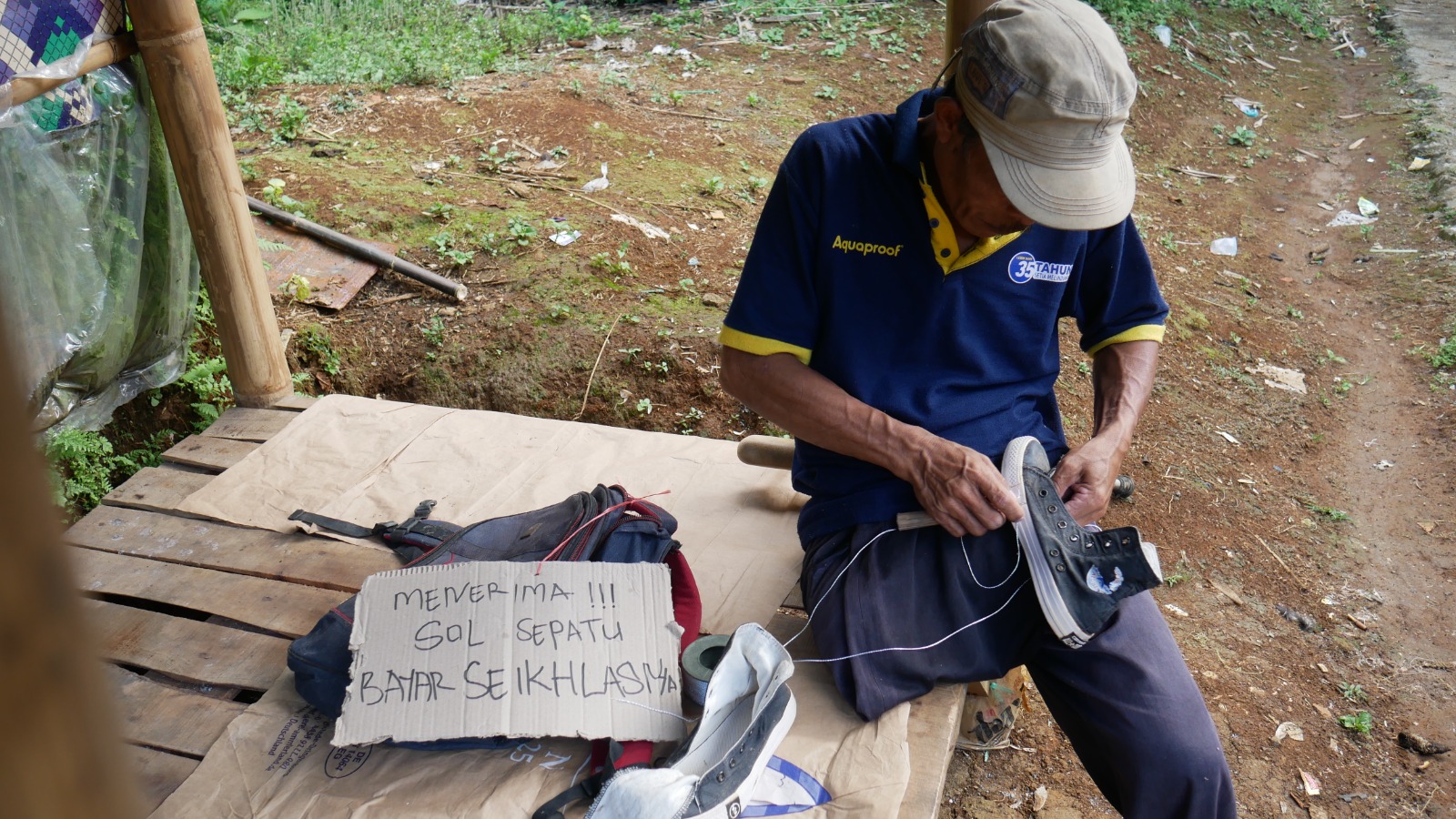 “Akhirnya saya sadar harus bangkit. Ga boleh terpuruk kaya gini. Saya mulai usaha meski sempat kepayahan karena keterbatasan fisik. Akhirnya, karena coba-coba saya benerin sepatu keponakan yang rusak dengan alat seadanya, sampe akhirnya ternyata banyak tetangga yang minta sepatunya dibenerin”, ujarnya.