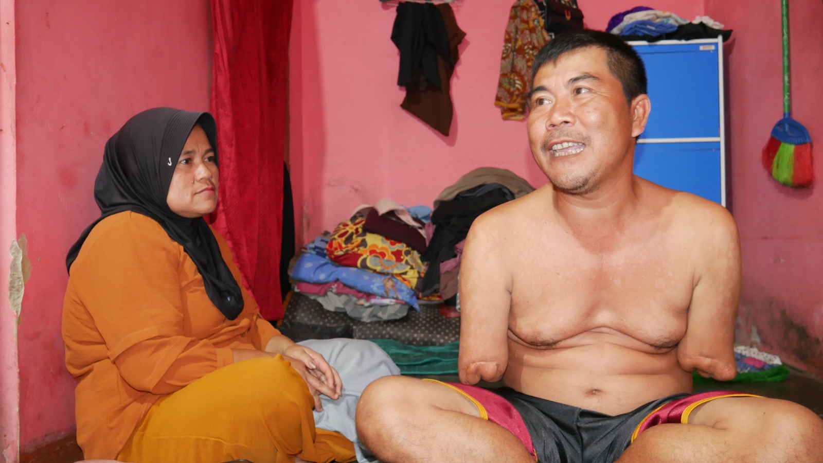 Awalnya Istri Pak Wahyu, Bu Dedeh (41 tahun) menolak karena merasa kasihan jika suaminya tersebut tidak memiliki tangan.“Asli Pak Waktu itu saya belum ikhlas kalau kedua tangan Bapak dipotong. Kasian banget kalau gak punya tangan, terus gimana nanti mau kerja kalau gak ada tangan, belum lagi anak masih sekolah…”, ucap Bu Dedeh.