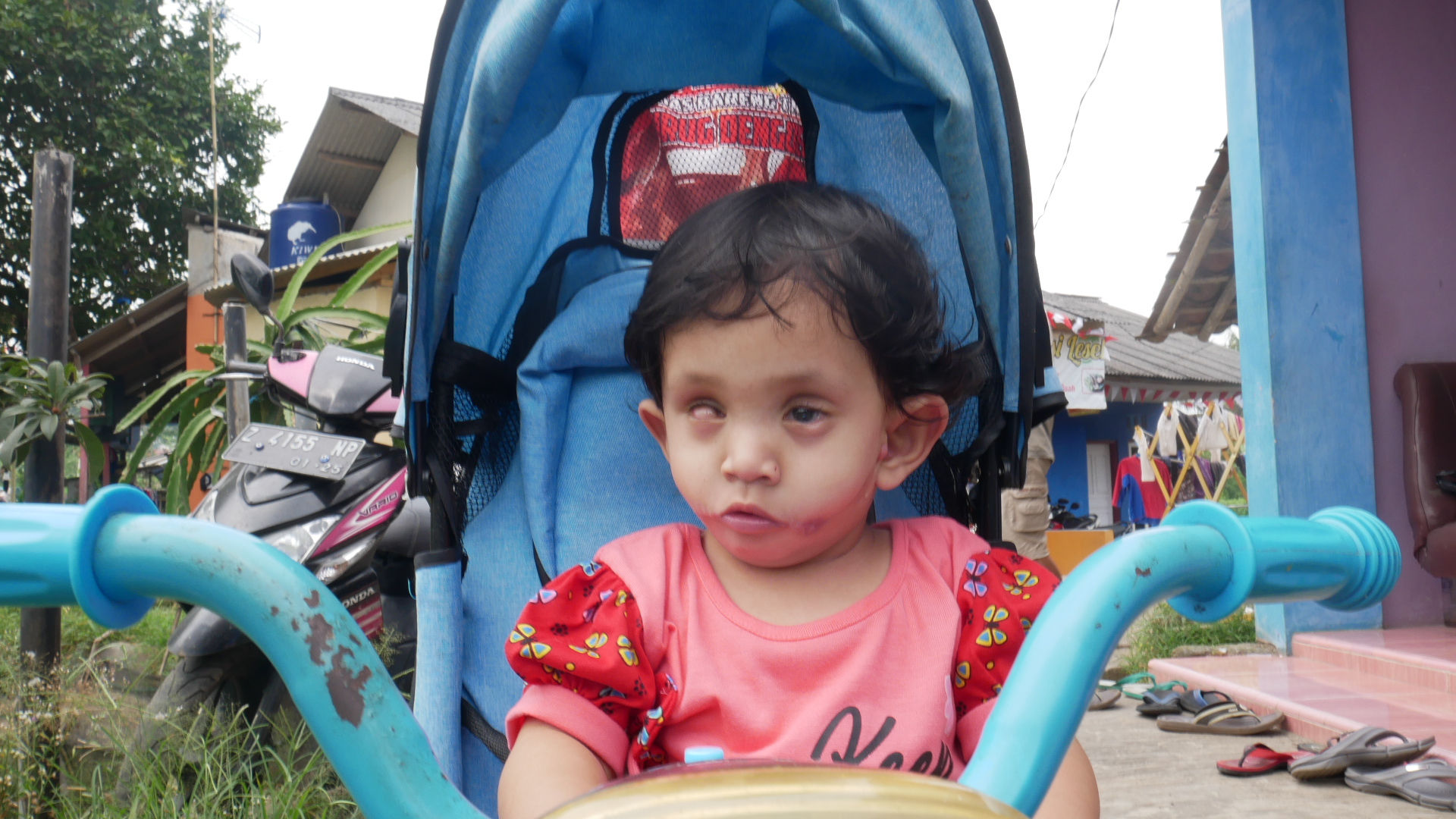 Kondisi bibirnya yang lebar hingga ke telinga, Risha (1) kesulitan menguyah makanan dan bernafas. Kelainan pada struktur wajah terutama bibir dan matanya disebabkan oleh penyakit Syndrome Treacher Collins (STC). Penyakit ini mengakibatkan pertumbuhan Risha terhambat, buta kedua matanya, ususnya membengkak karena kesulitan buang air besar.