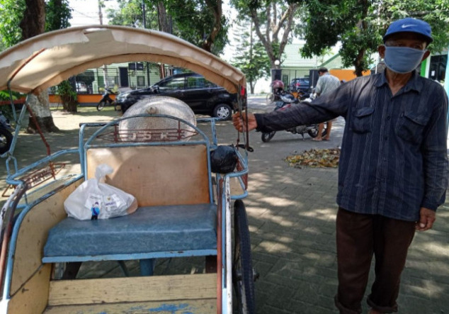 "Biasanya setiap hari ada pelanggan tetap seperti mengantar anak sekolah, penghasilan gak menentu sekitar 20-40ribu. Sekarang dapat 20ribu saja alhamdulillah. Soalnya sering juga saya pulang gak bawa apa-apa. Saya tinggal dengan anak yang sudah SMA di kos-kosan yang biaya per bulannya 300ribu", ujar Pak Suratman, penarik becak di Ngadisimo, Kota Kediri.