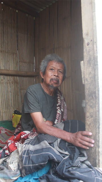 Bahkan untuk tidur saja Abah tak bisa meluruskan kakinya. Pria tua yang bernama Abah Rahmat itu sudah tak lagi mampu berjalan akibat menderita kelumpuhan. Kedua kakinya tak lagi bisa ia gerakan semenjak ia terjatuh saat bekerja sebagai buruh bangunan empat tahun yang lalu. Di dalam bangunan kecil tersebut Abah Rahmat tidur, makan dan buang air.