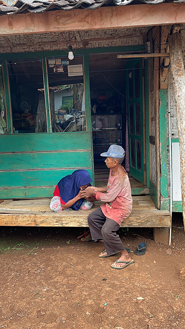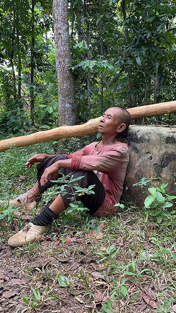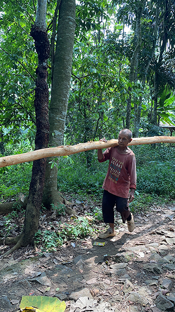 Abah Karna (77) tampak tengah memikul sebatang pohon yang cukup besar menyusuri hutan yang sepi. Tubuhnya yang tak lagi muda ia paksakan berjalan membawa beban yang sangat berat. Ia terpaksa harus beberapa kali berhenti untuk sejenak beristirahat melepas lelah di tubuhnya. Kayu seberat kurang lebih 50 kg harus ia bawa dari kebun milik orang lain kerumahnya dengan jarak yang cukup jauh.