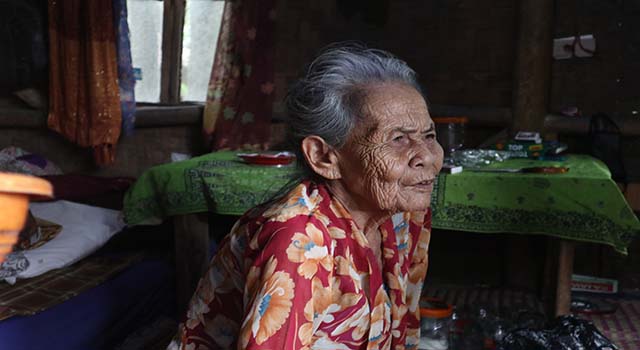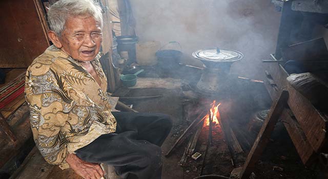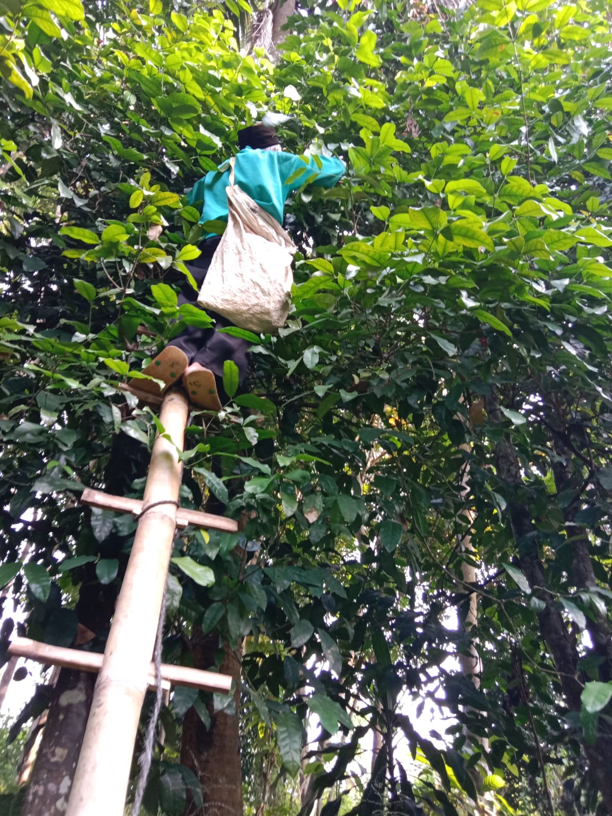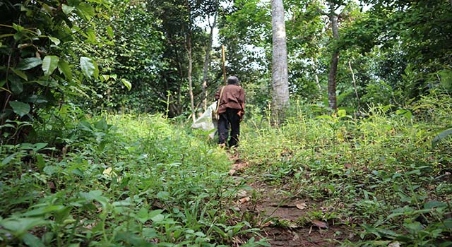 Jarak yang jauh dan terjal ia lalui setiap hari dengan tubuh tuanya. Sesampainya di perkebunan ia segera membawa tangga bambu sederhana yang cukup tinggi dan berat untuk mencari daun melinjo yang bisa ia petik. Pepohonan yang tinggi tak sedikitpun membuat ia ragu untuk naik.