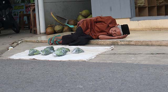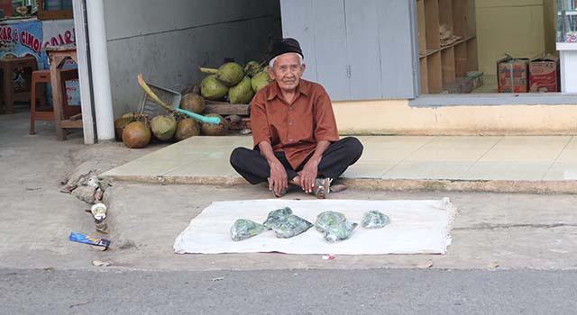 Jarak menuju tempatnya menjajakan daun melinjo itu juga tak terbilang dekat dari tempat tinggalnya. Abah Rohim terlihat dengan sabar menunggu pembeli yang datang. Abah Rohim kadang tertidur ketika itu, mungkin tubuh rentanya lelah setelah melalui hari yang panjang dan tak mudah.