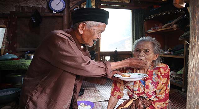 Barulah setelah selesai mencuci dan nasi yang ia masak telah matang, ia segera menyuapi isterinya yang mengalami kebutaan karena penyakit katarak yang dideritanya.